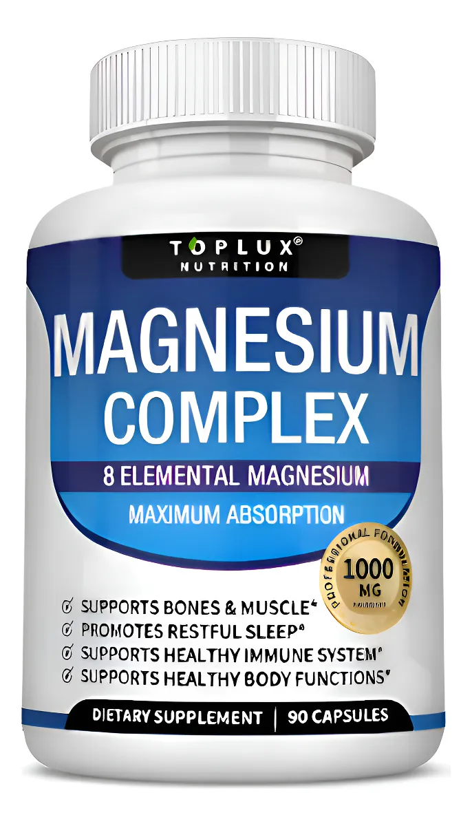 CONTIENE 60 CAPSULAS Disfruta de los beneficios de la relajación y el bienestar con el Suplemento De Magnesio Complex de Toplux. Este producto ha sido formulado específicamente para apoyar la relajación muscular y combatir el estrés, promoviendo una experiencia de descanso más profunda y reparadora. Ideal para adultos mayores de 18 años, su ingesta contribuye a mejorar los ciclos del sueño, ayudando a que cada noche sea una oportunidad para revitalizar tu cuerpo y mente. El magnesio es un mineral esencial que desempeña un papel crucial en numerosas funciones corporales, incluyendo la regulación de la actividad muscular y nerviosa. Al incorporar este suplemento en tu rutina diaria, facilitarás un equilibrio que puede resultar en una reducción de la tensión y un aumento en el bienestar general. En formato de cápsula, su fácil administración se adapta a un estilo de vida moderno y activo. El Suplemento De Magnesio Complex es vegano y libre de gluten, lo que lo hace accesible para diversas necesidades dietéticas. Sin lactosa, se convierte en una opción ideal para quienes buscan fortalecer su salud sin comprometer su alimentación. Confía en Toplux para proporcionarte un producto diseñado con rigurosidad y formulaciones de alta calidad, pensado en tu bienestar integral. MODO DE USO Dosis diaria recomendada: Tomar 1 cápsula al día. Forma de administración: Vía oral, con un vaso de agua Momento ideal para tomarlo: Preferiblemente junto con una comida, para mejorar la absorción y evitar molestias estomacales.